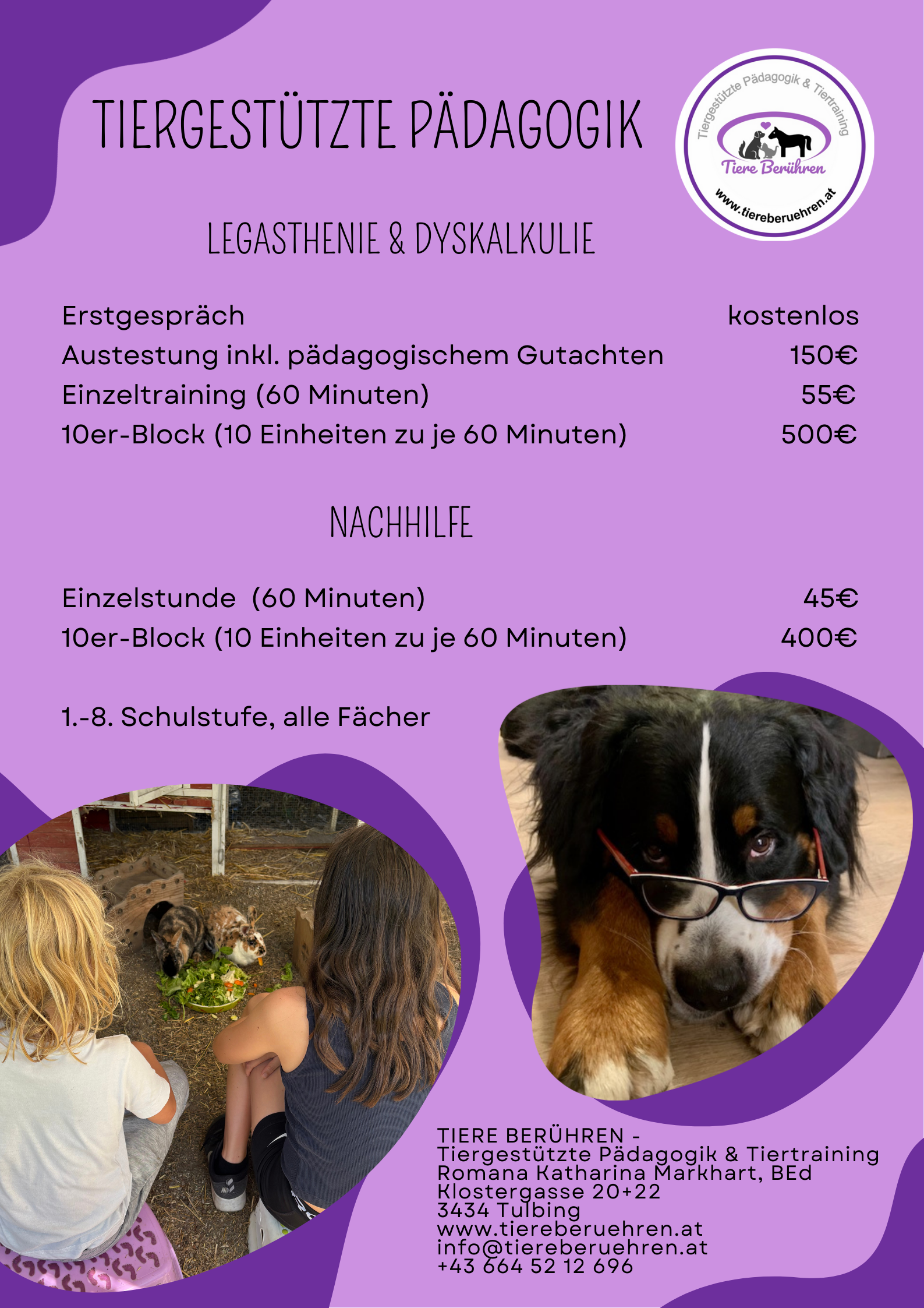 Herzlich willkommen bei Romana Katharina Markhart, BEd in Tulbing! Hier steht die Kraft der Tiere im Mittelpunkt, um Kindern und Erwachsenen neue Wege zu zeigen. Mit tiergestützter Pädagogik begleite ich Kinder beim Lernen, helfe bei Legasthenie und Dyskalkulie und schaffe unvergessliche Workshops. Die tierische Verbindung kann Fähigkeiten stärken, Empathie fördern und Lernen zum Erlebnis machen. Entdecken Sie mein vielfältiges Angebot und buchen Sie Ihre tiergestützte Pädagogik direkt hier im Bezirk Tulln, Niederösterreich.